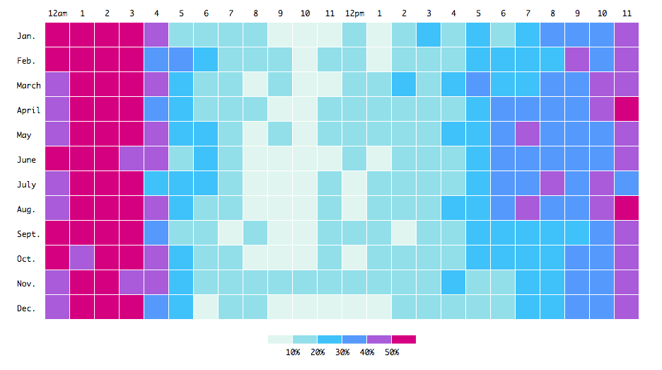 Heat maps use color gradients to represent values in a matrix or table, making them practical for visualizing large datasets and identifying patterns or clusters. Heat maps display website traffic data in web analytics, where brighter colors indicate higher traffic levels. This helps businesses understand user behavior and optimize website design for better engagement. According to Crazy Egg, heat maps are essential for improving user experience and increasing conversion rates.
